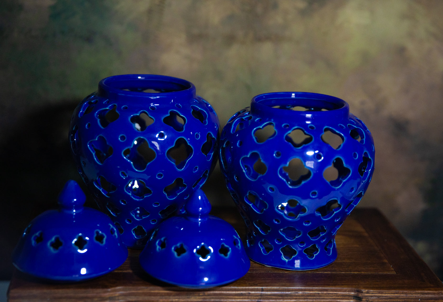 Product Story: Elevate your ambiance with this handcrafted ceramic lantern. Its rich cobalt blue glaze and cutout clover pattern cast enchanting shadows when a candle is lit inside. Whether placed on a mantel, patio table, or entryway, it offers both warmth and visual interest.