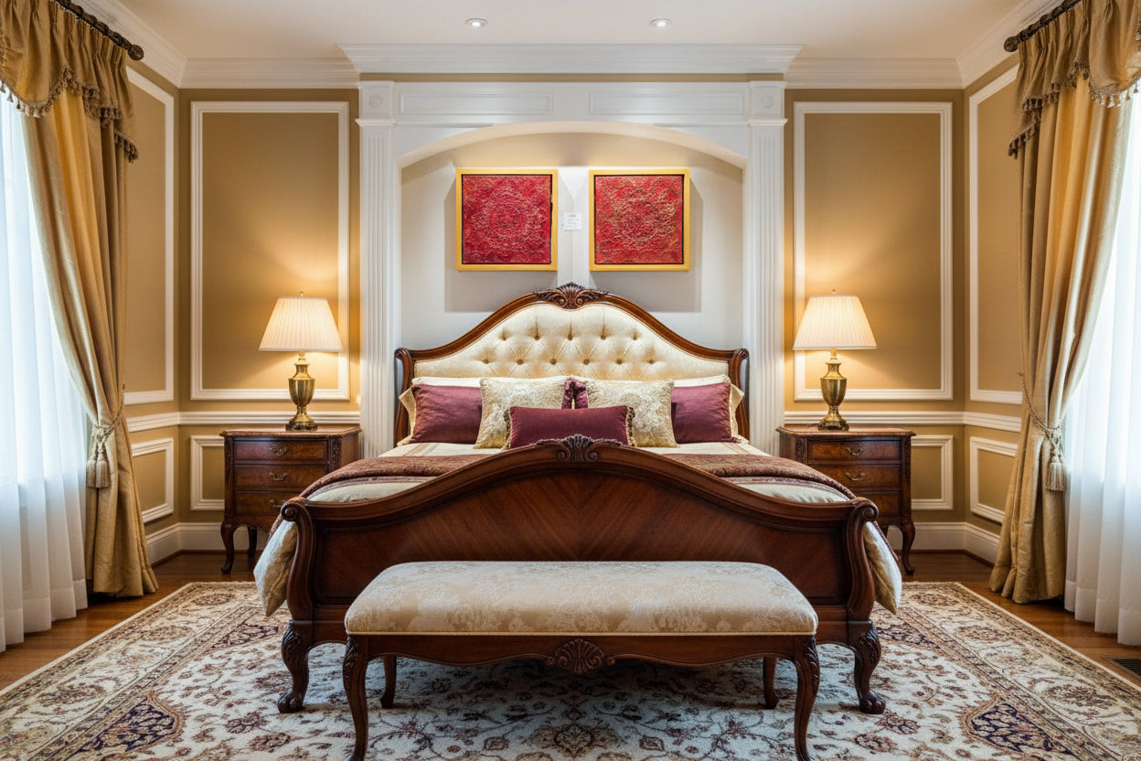 - Palette: Deep red, gold, bronze, and umber
