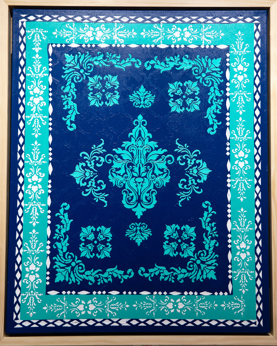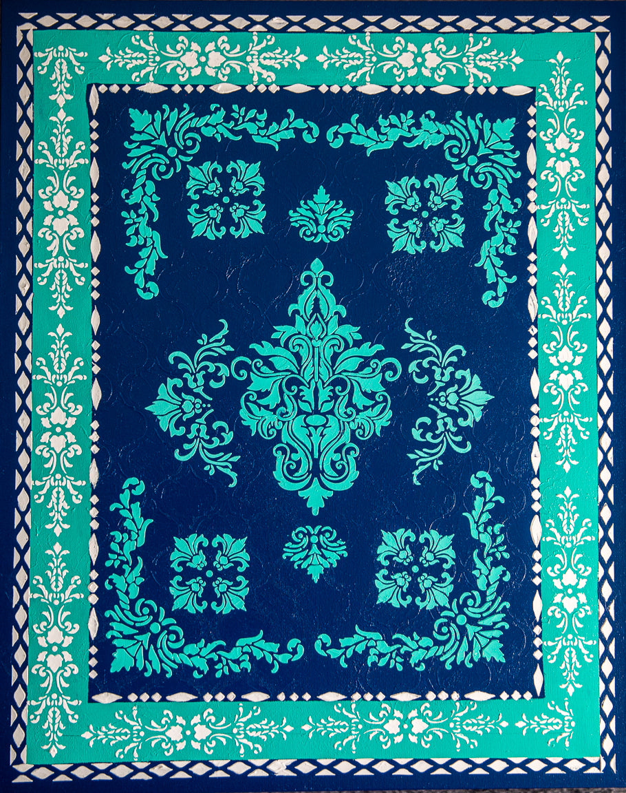 The symmetry and repetition of the patterns evoke both calm and opulence—like the serenity of dusk settling over a royal courtyard. Hand-textured surfaces and stenciled flourishes in teal and white rise from the midnight-blue backdrop, revealing Syeda’s signature blend of heritage craftsmanship and contemporary vision.