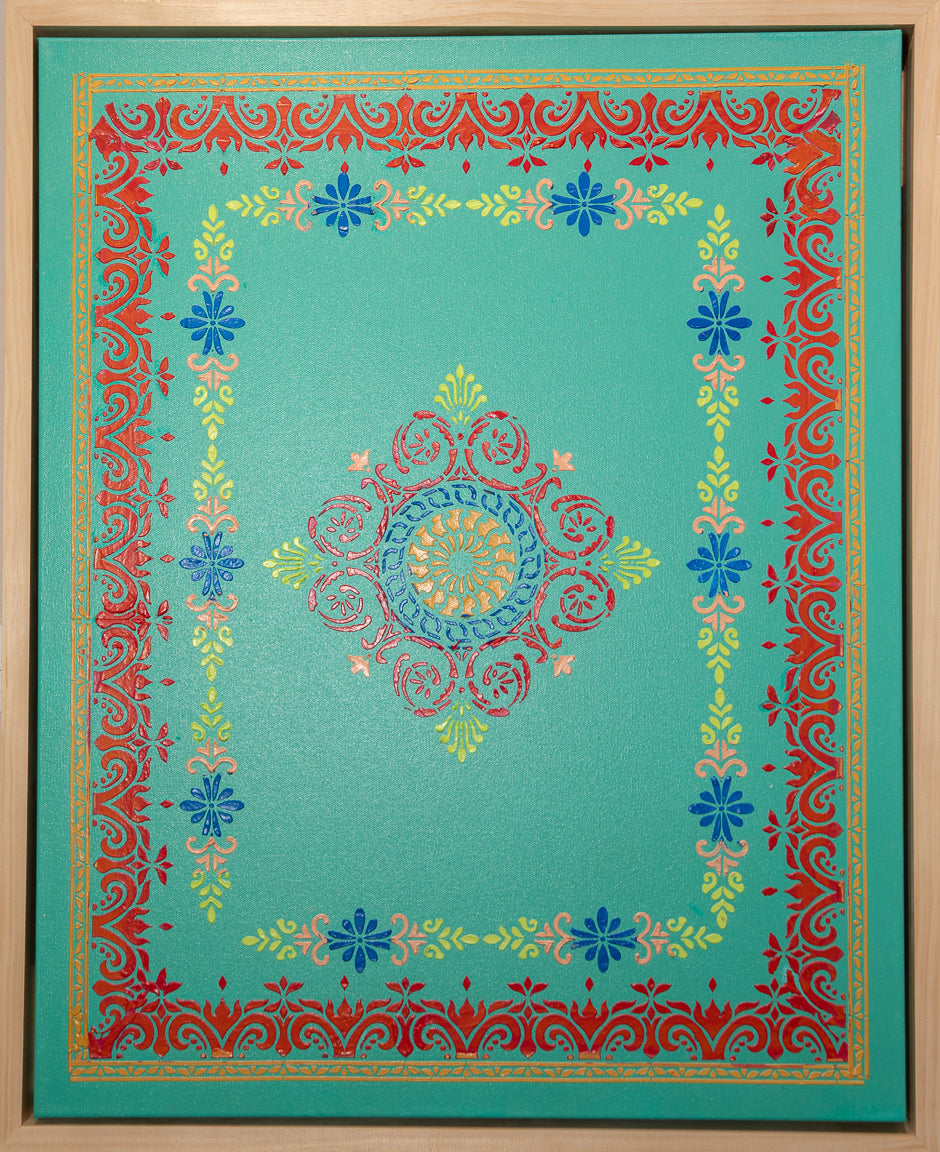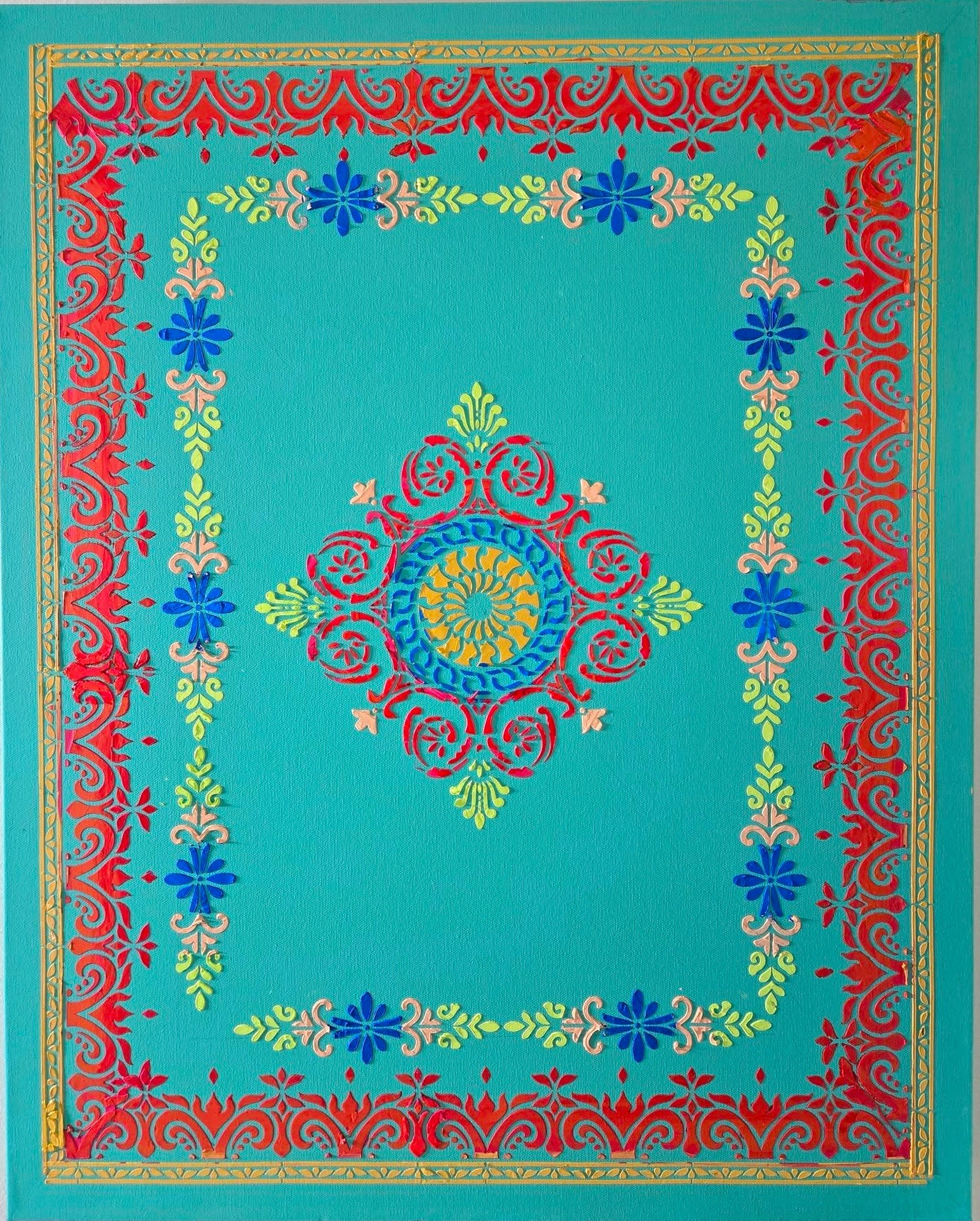 Ornamental Blossom Tapestry is a striking 36" x 24" acrylic painting that evokes the grandeur of South Asian palace textiles and prayer rugs. Painted by Syeda Mleeha Shah, this bold composition blends traditional ornamental borders with floral symmetry in vibrant hues of turquoise, crimson, marigold, and royal blue.